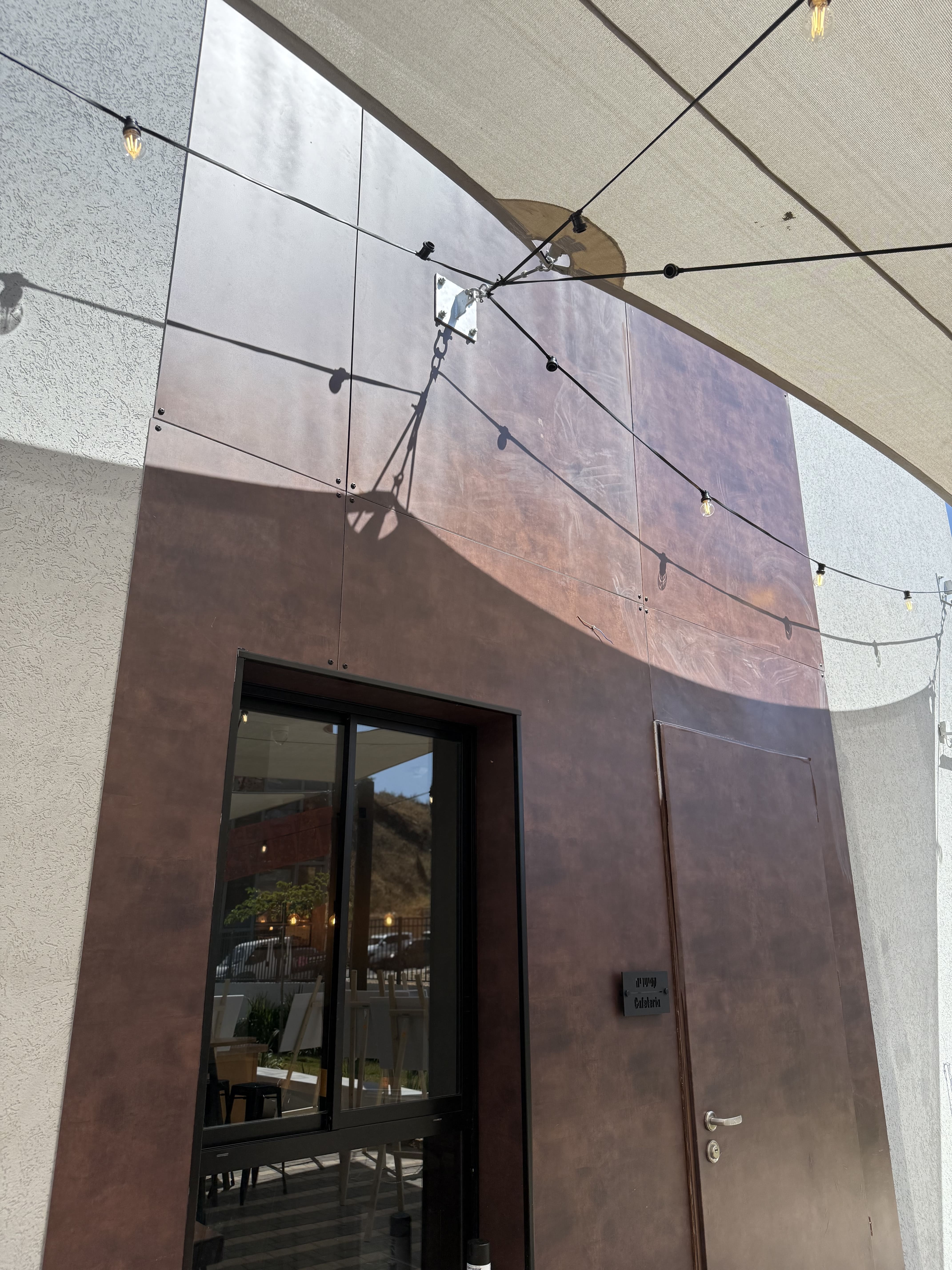 הפרויקט דרש פתרון שיחזיק שמש ולחות, ובמקביל ייתן למבנה נוכחות. נבחר לוקובונד בעובי 4 מ”מ עם גוון Corten שפותח במיוחד לפרויקט.